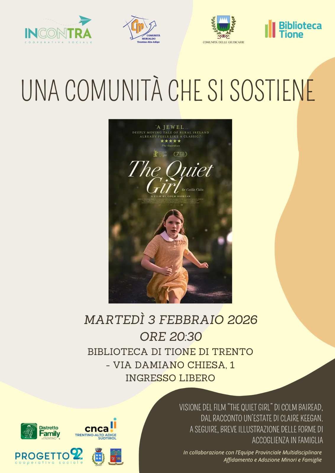 La Cooperativa Incontra, in collaborazione con la Comunità di Valle della Giudicarie, Comunità Murialdo e Cooperativa Progetto 92, ha organizzato una serata di sensibilizzazione e promozione dei servizi di accoglienza e affido familiare presso la biblioteca di Tione di Trento. E’ una serata gratuita, durante la quale verrà proiettato il film “The Quiet Girl” di Colm Bairéad, tratto dal racconto Un’estate di Claire Keegan: una storia delicata e profonda che parla di infanzia, cura e accoglienza.